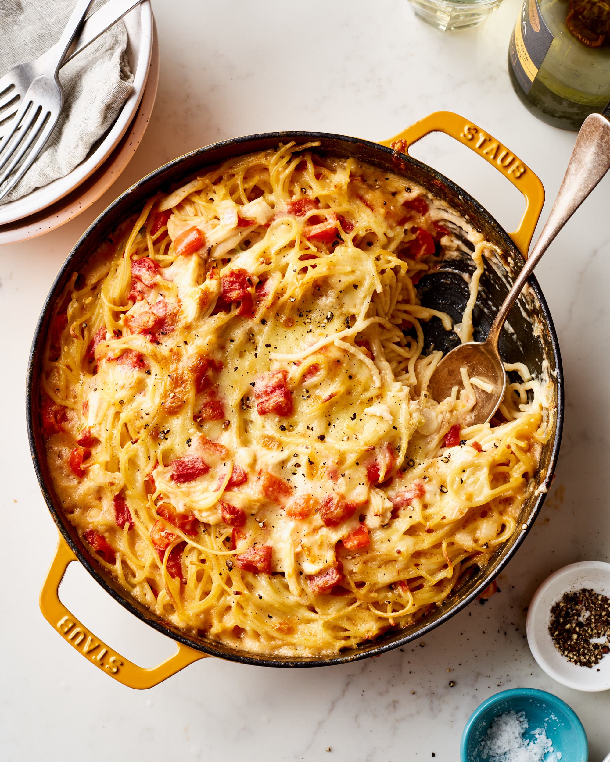 If ‘teri' means ‘shine,' and ‘yaki' refers to grilling, then these chicken skewers are the poster children for teriyaki. Marinated in soy sauce, sake, and mirin, the chicken is grilled to sweet, smoky perfection and dipped in a refreshing, herby miso ‘ranch' sauce that'll send your summer cookout guests into a frenzy. The only bottles not invited to this party are bottled teriyaki sauces! Garnish with sesame seeds if desired.Ingredients | Chicken Pasta Easy Chicken Recipes For Dinner For Families